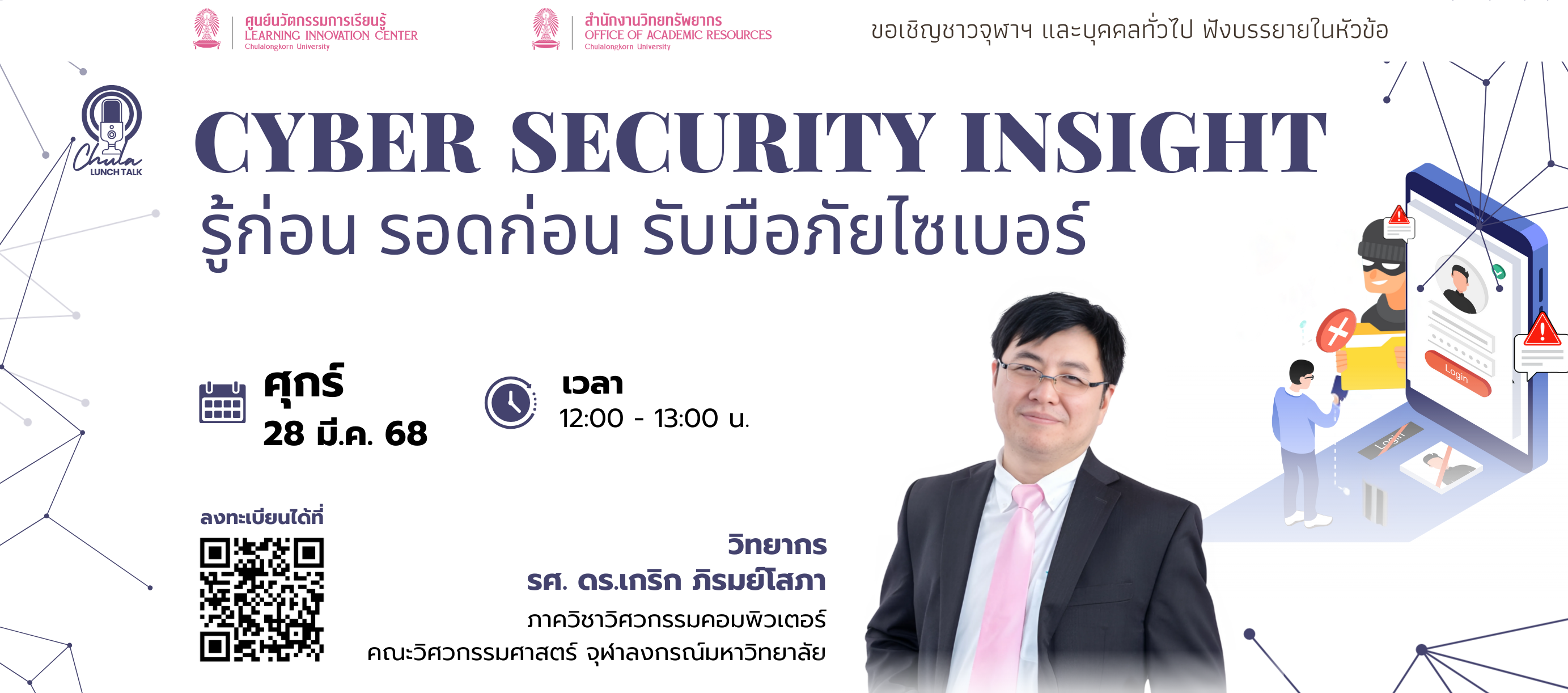 ขอเชิญชาวจุฬาฯ และบุคคลทั่วไป เข้าฟังบรรยายในหัวข้อ: Cyber Security Insight: รู้ก่อน รอดก่อน รับมือภัยไซเบอร์